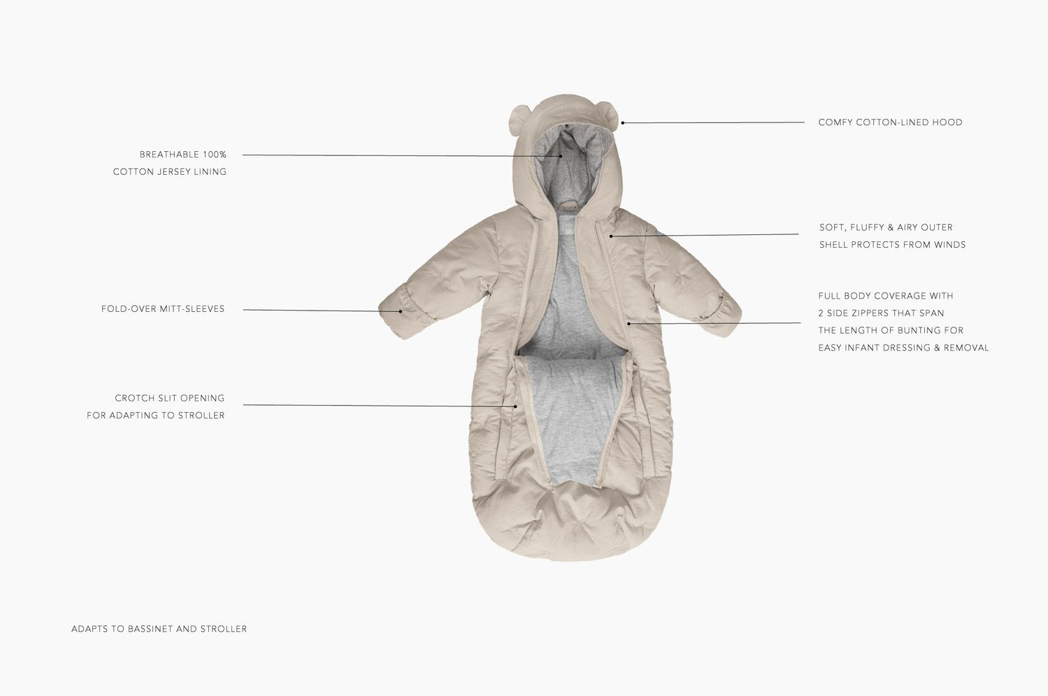 - Full-body coverage with 2 side zippers that span the length of bunting for easy infant dressing & removal.
