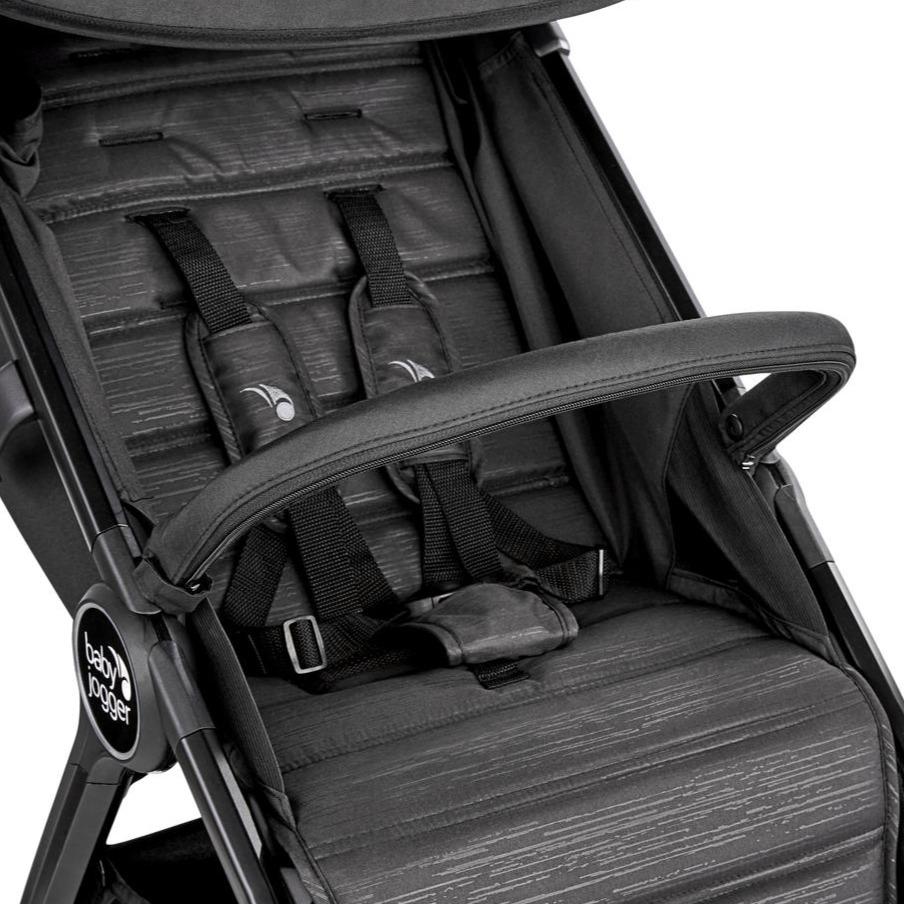 The Belly Bar easily connects to the stroller to give your child a safe and comfortable area to hold on to while strolling and adjusts at the push of a button.