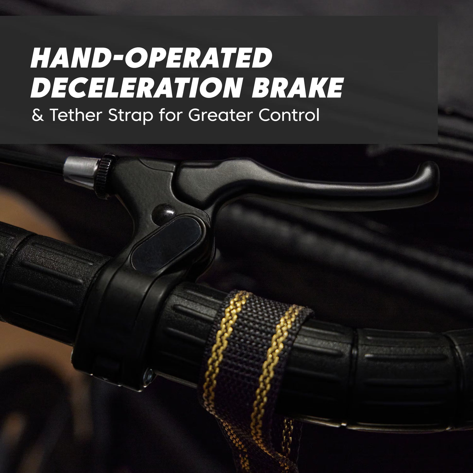 - The unique, hand-operated deceleration brake and handlebar tether strap keeps you in control.
