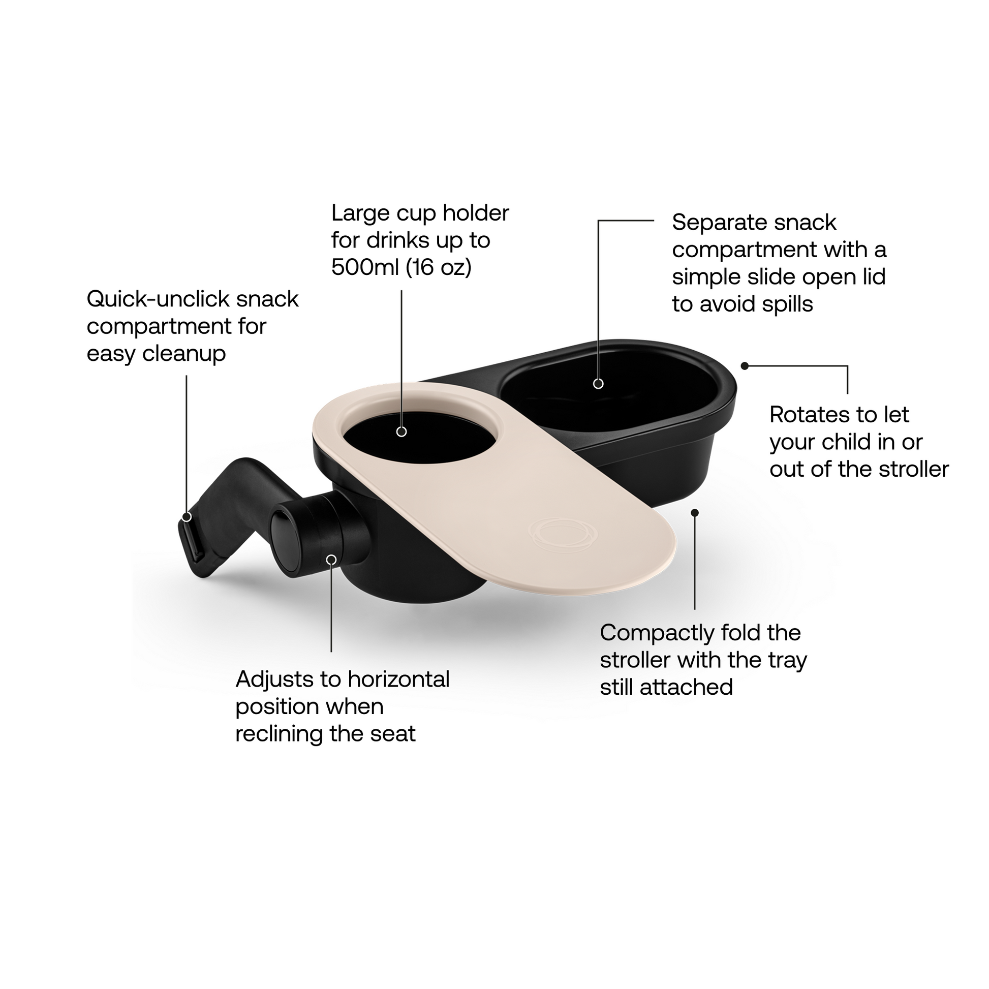 The Bugaboo Stroller Tray ensures the satisfaction of young travelers by providing a secure clip for storing snacks and drinks. Featuring a slide-open lid, the dishwasher-safe snack compartment allows for effortless cleaning. It conveniently remains attached while folding the stroller.