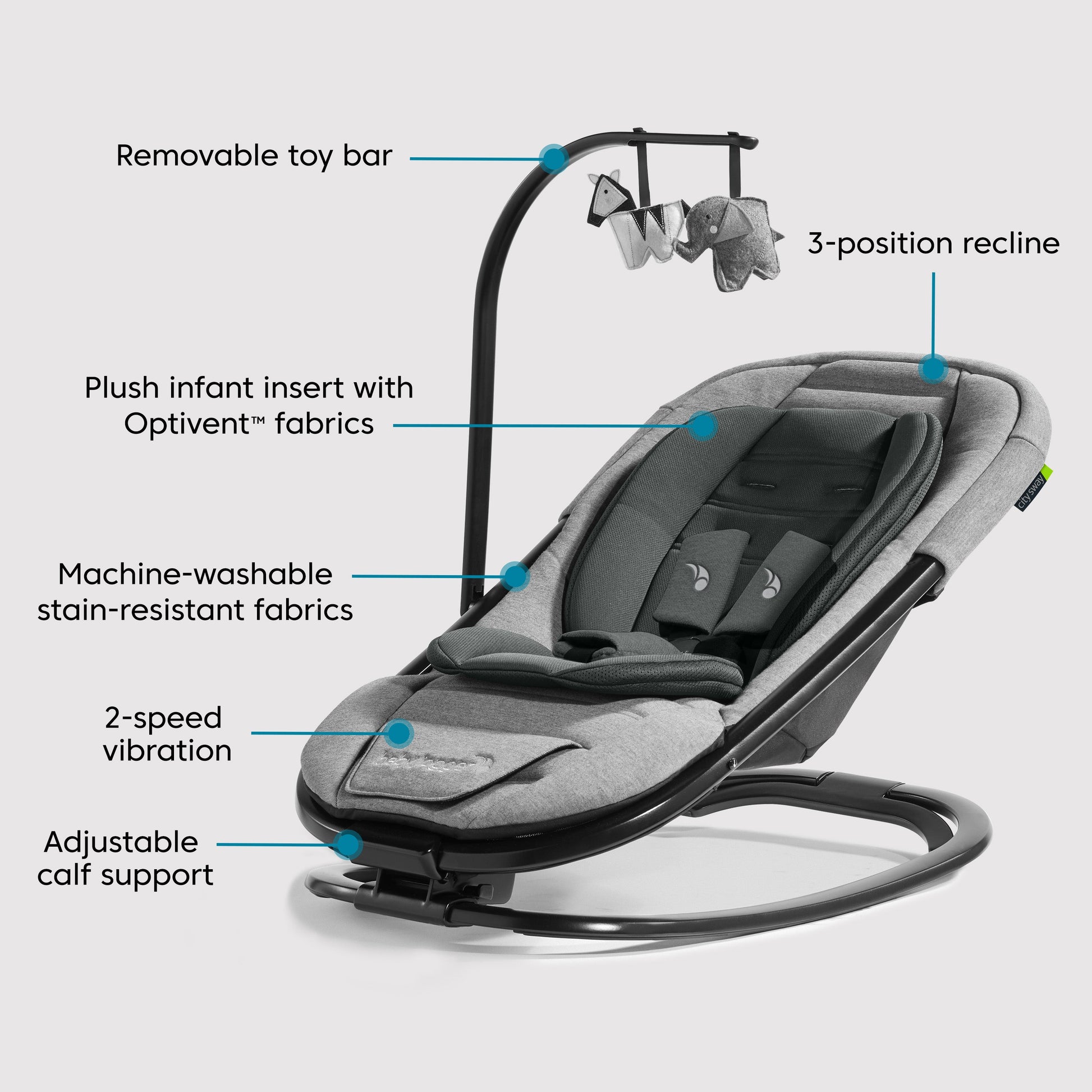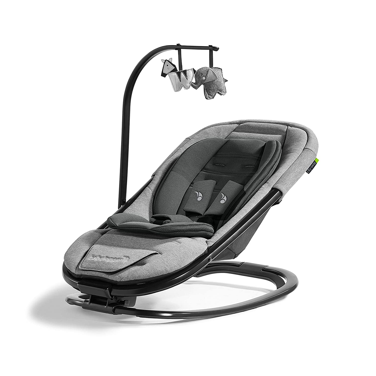 The Baby Jogger City Sway Rocker doubles as a bouncer to soothe and play at home or away. By engaging the kickstand, you can easily transition from rocker to bouncer mode to keep baby content and entertained. City sway folds flat and can be securely stored or protected during transit with the included storage bag. The removable toy bar includes two premium fabric toys that will help keep baby engaged with a rattle and crinkle paper to excite and delight.