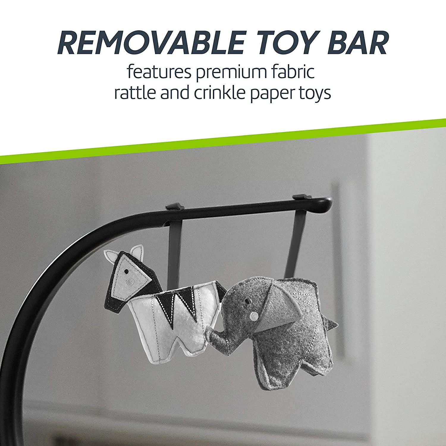 - Removable toy bar includes two premium fabric toys that feature a rattle and crinkle paper to keep baby entertained.
