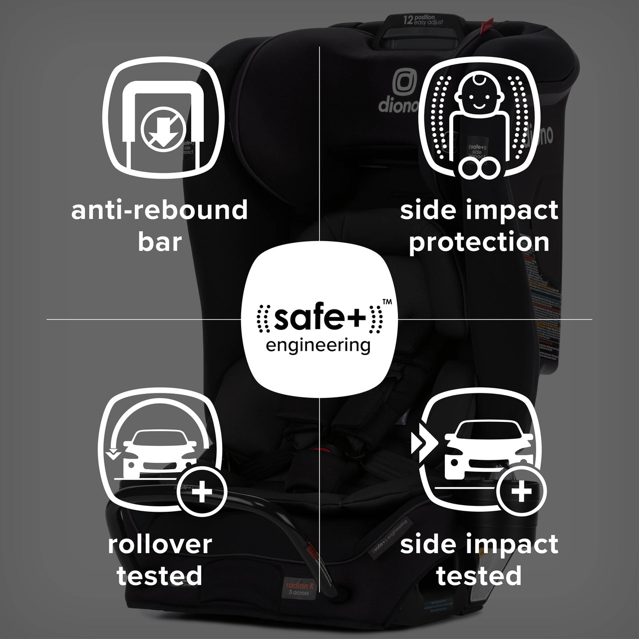The Diono Radian 3RXT Safe+ Convertible Car Seat will enhance your travel experience with its innovative features. It offers Safe+ engineering, an anti-rebound bar, and advanced side impact protection for complete security from birth to booster. Its compact structure enables 3 seats to be aligned in a row with guaranteed comfort. It also includes a newborn protective insert and a high wedge to safely keep your baby in a comfortable flat back position.
