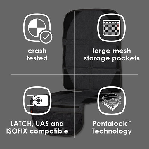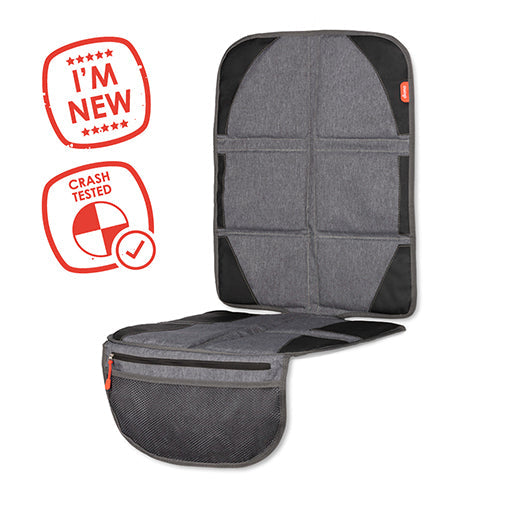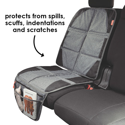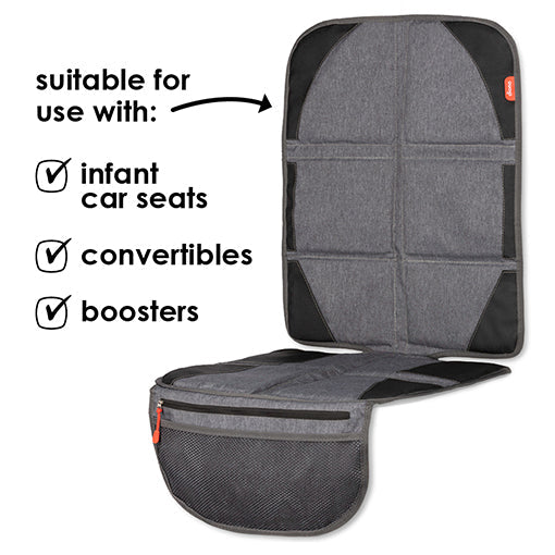 The Diono Ultra Mat covers the complete seat upholstery of your car and prevents it from getting worn off by your car seat. In addition this mat provides a mesh organizer to keep small gadgets as a pacifier, snack, or wipes handy. In addition, a zippered pocket hosts a car seat heat shield to keep your buckles and car seat cool.