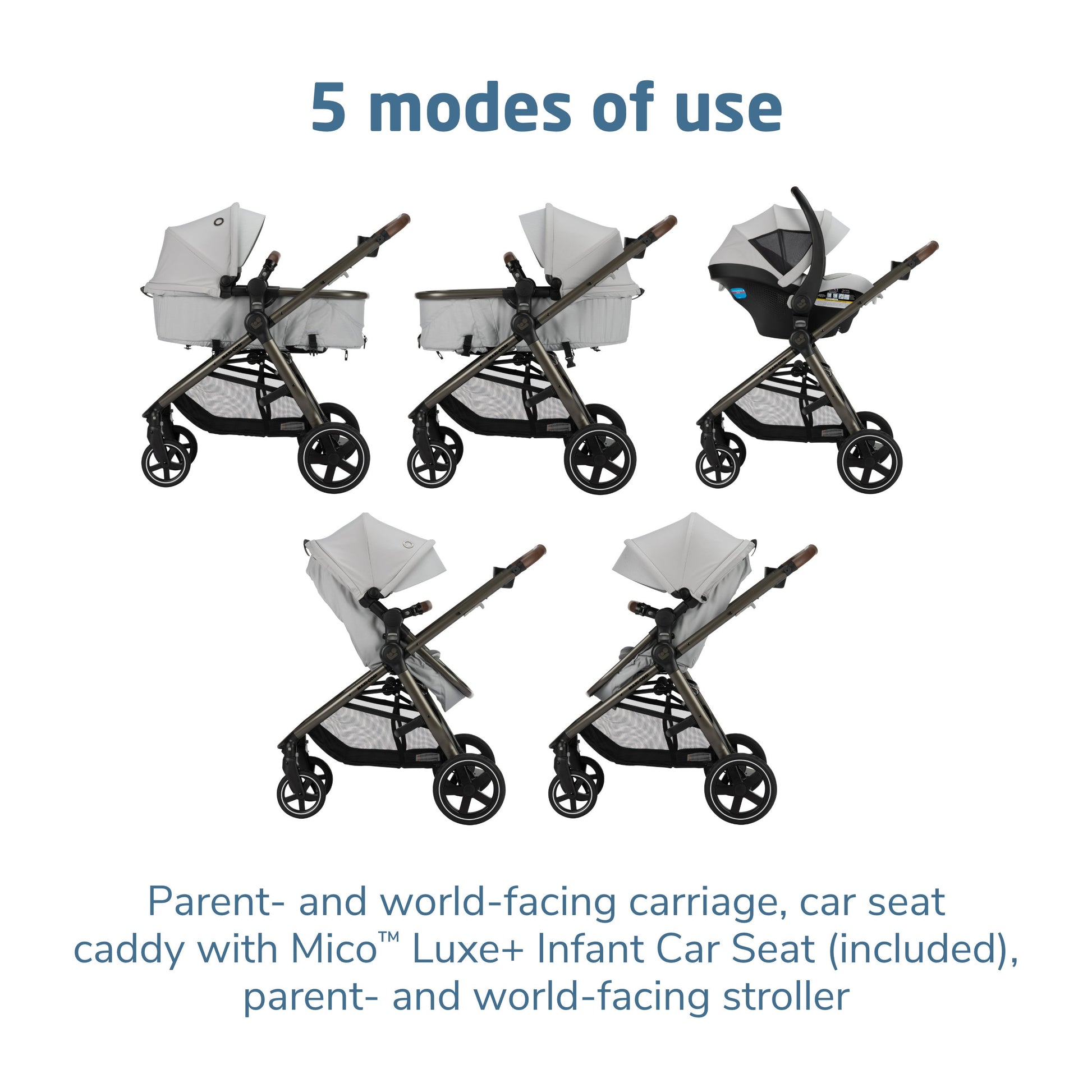 - Choose between 5 modes of use: parent-facing car seat caddy, reversible carriage, and reversible stroller.