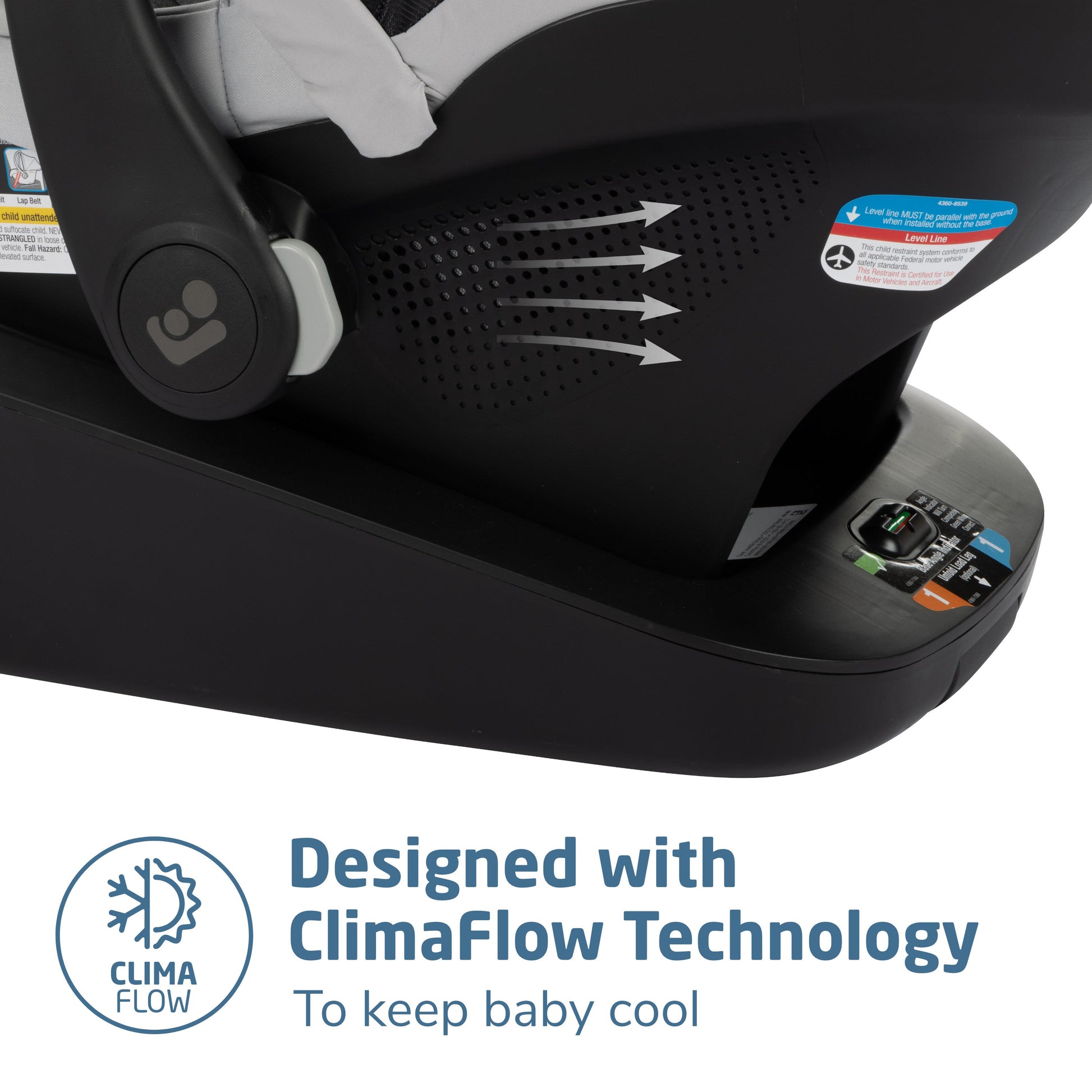 - Infant car seat shell designed with ClimaFlow™ technology, providing added ventilation to help keep baby cooler.