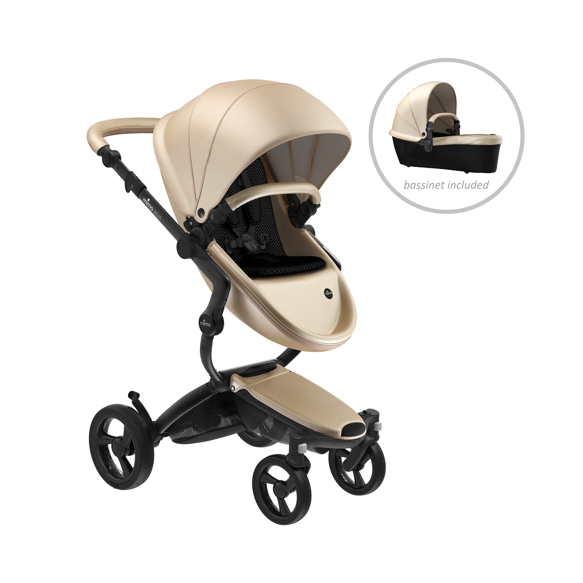 The Mima Xari 4G Completer Stroller is an iconic elite pushchair offering enhanced unique features. This stroller includes a newborn cot and toddler seat capable of transition in 3 recline levels, both in parent and street-facing position. The sun canopy, the bassinet, and the seat comprise enhanced vegan leather that easily wipes clean. The complete stroller is equipped with a comfortable mattress and from birth starter kit in several eye-catching prints. In addition, the adjustable seat height, harness straps, handlebar, and bumper bar create a custom fit that contours to parents' individual needs. When the bumper bar is upright, easily remove the seat for a simple freestanding compact fold. A functional carry strap is provided for practical travel.