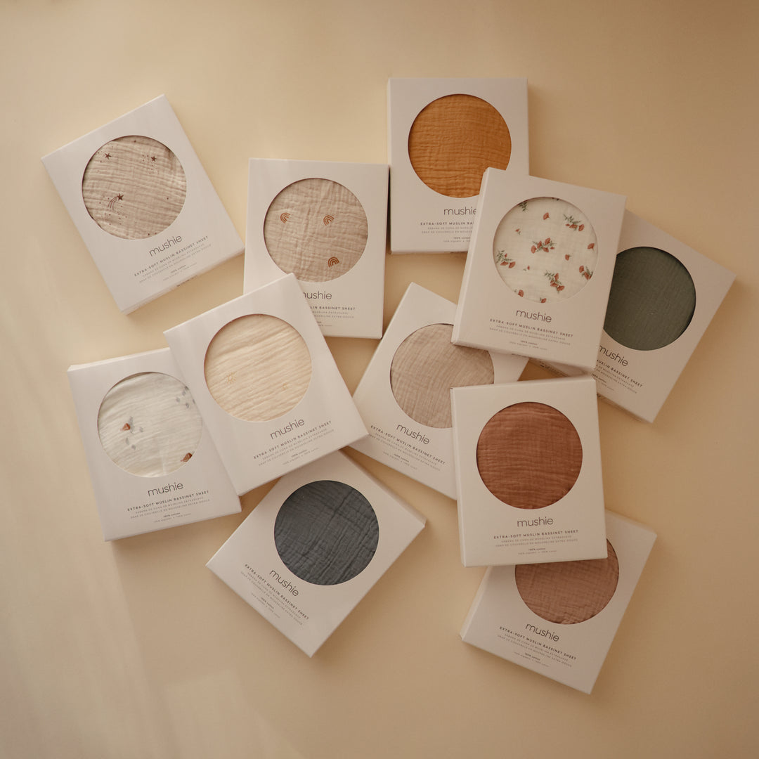 Made from 100% cotton, the Mushie Extra Soft Muslin Bassinet Sheet is pre-washed for softness against the baby's delicate skin. Muslin stays breathable while keeping your baby warm and cuddly.
