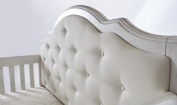 Like the playful nature of light that bounces off a crystal and makes rainbows on the wall, the architectural shapes paired with the upholstered cushion of the Cristallo Forever Crib provide a playful combination of refined styling and chic design. The Cristallo Forever Crib is an enchanting blend of classic lines paired with sweet touches of sophisticated luxury. The strong, clean design of this crib is highlighted by the layered moldings that frame both the front and the headpiece. These beautifully rounded layers provide texture and a nod to the elegance of classical architecture. Set in the headpiece of the crib is a sumptuously tufted panel. Providing a distinct sense of playful beauty, this sweetly textured cushion is designed with both style and use in mind.