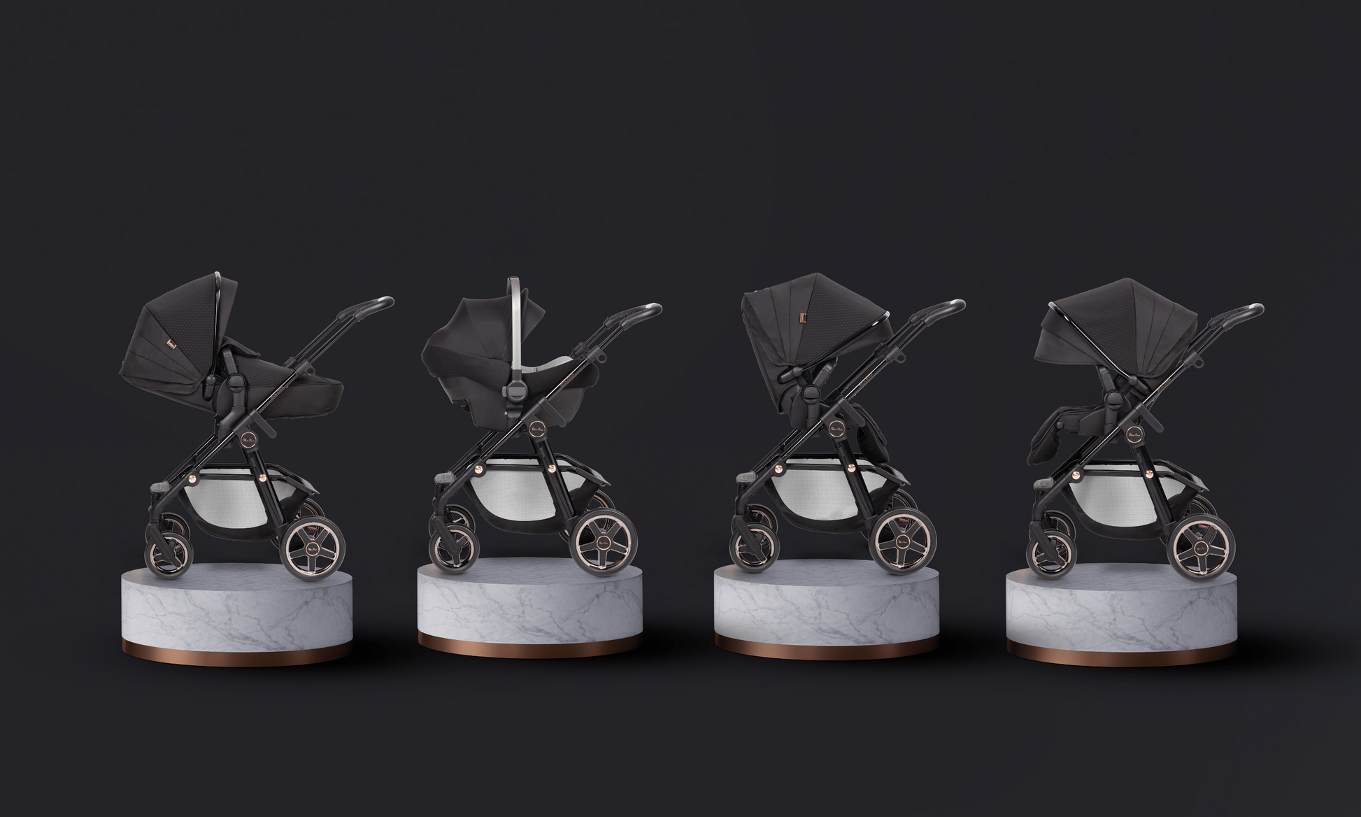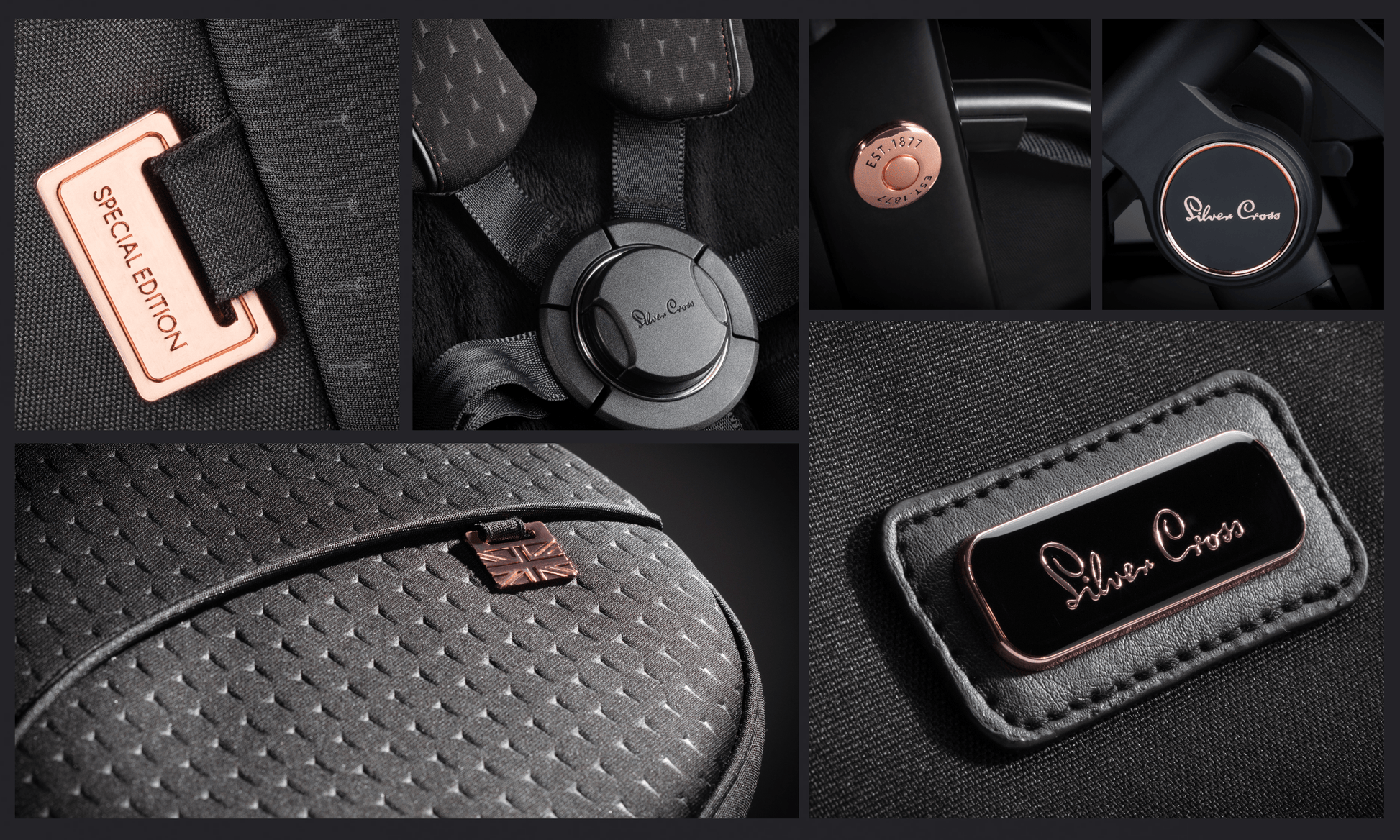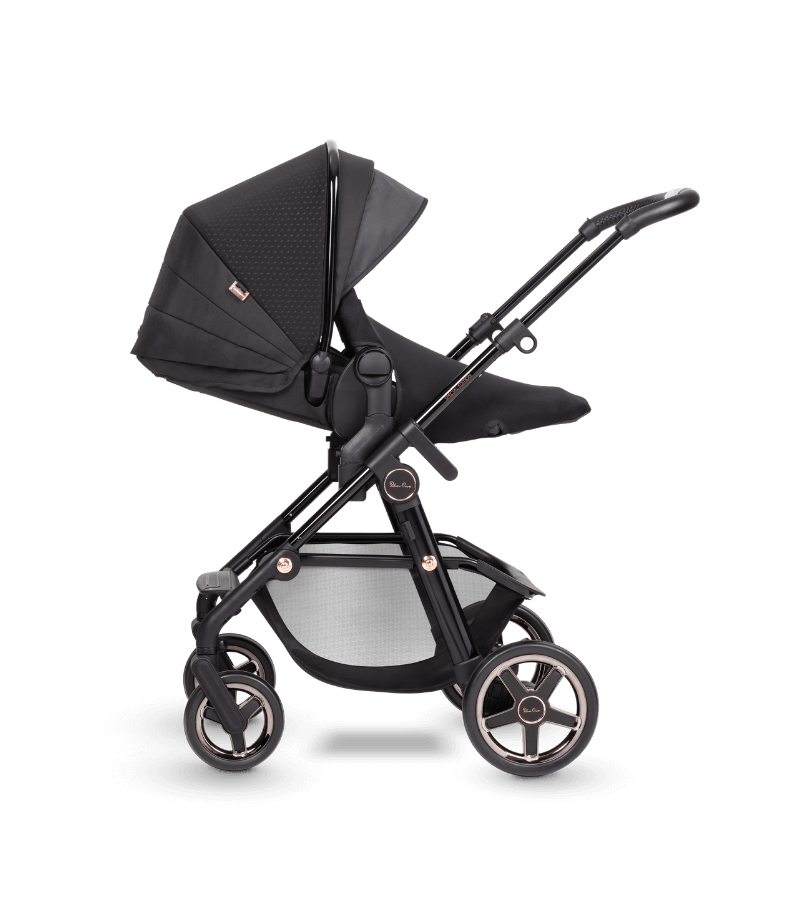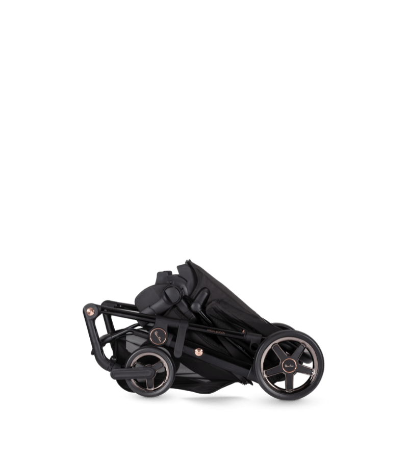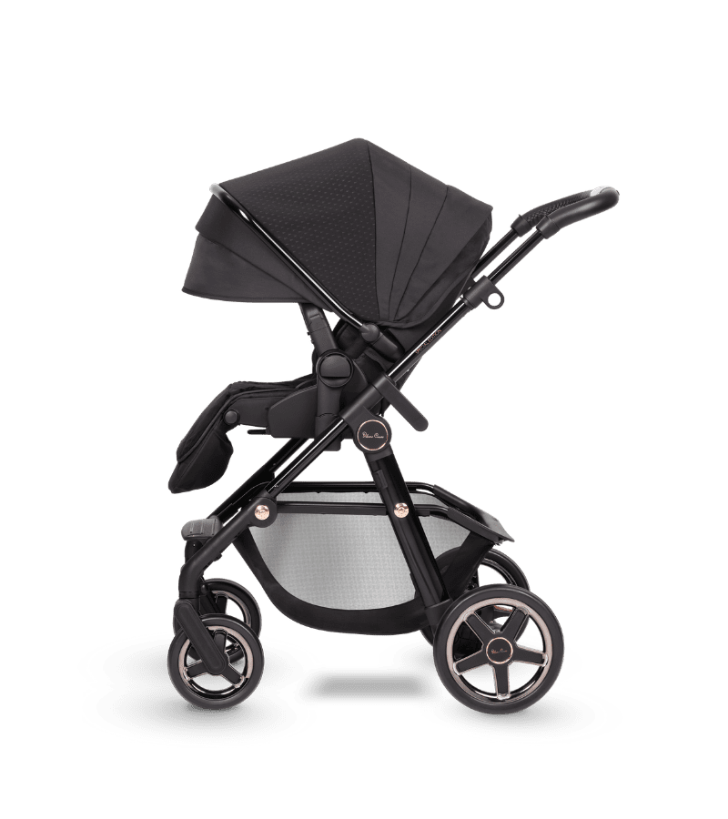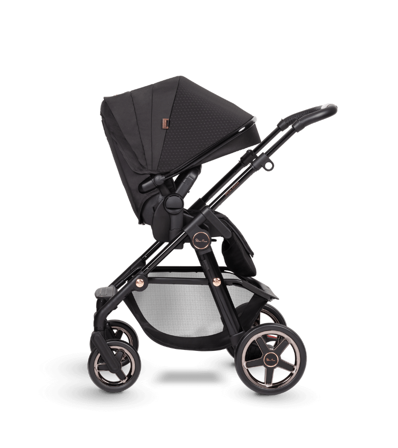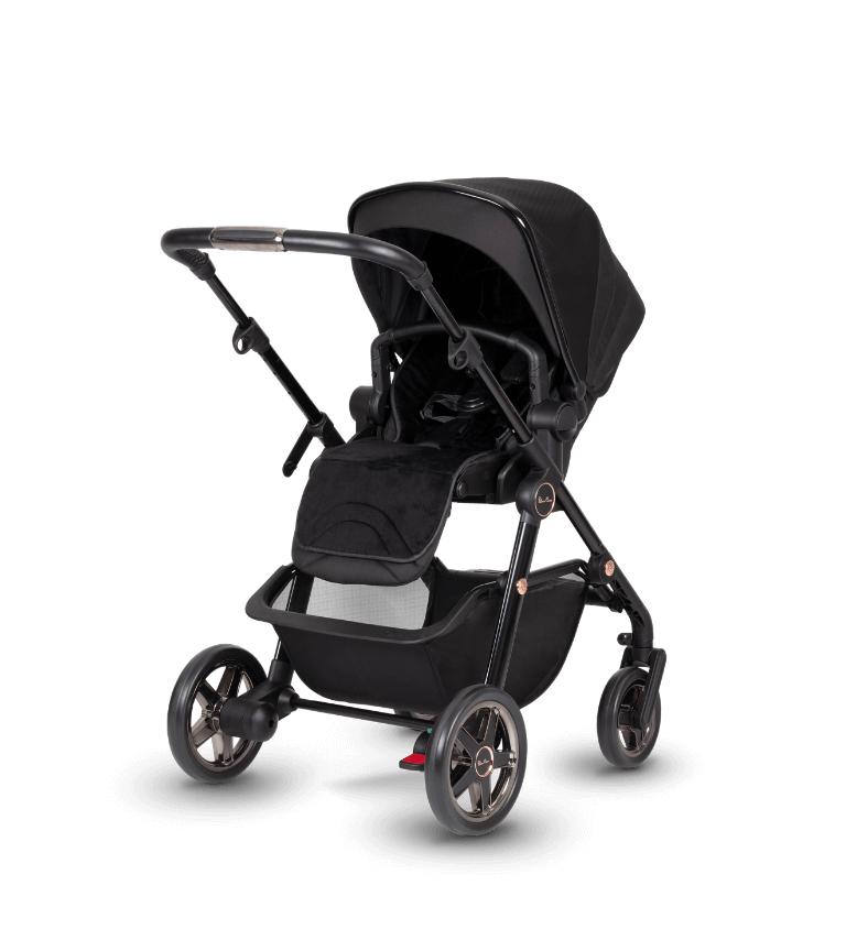 The Silver Cross Comet Eclipse is a striking Special Edition stroller with unique 3-D sculpted black fabrics, a high gloss chassis, and stunning rose gold highlights. Aside from style, this premium stroller also offers a one-seat strolling solution with usage from birth all the way up to 55 lbs, with no add-ons needed. With its four-wheel suspension and puncture-proof multi-terrain tires, you're in for an ultra-smooth ride!