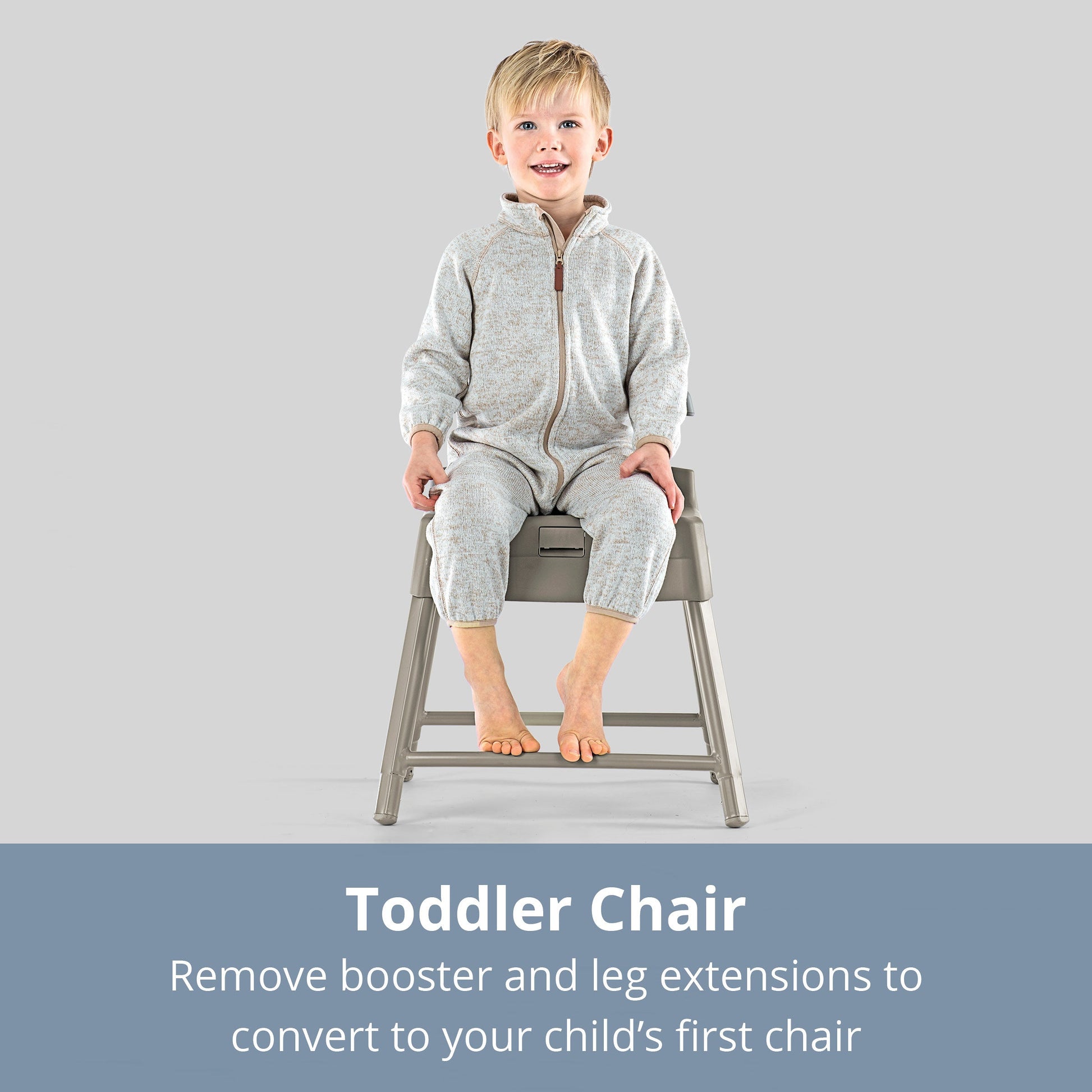 High chair seat easily detaches from the frame to create booster, chair, and stool configurations.