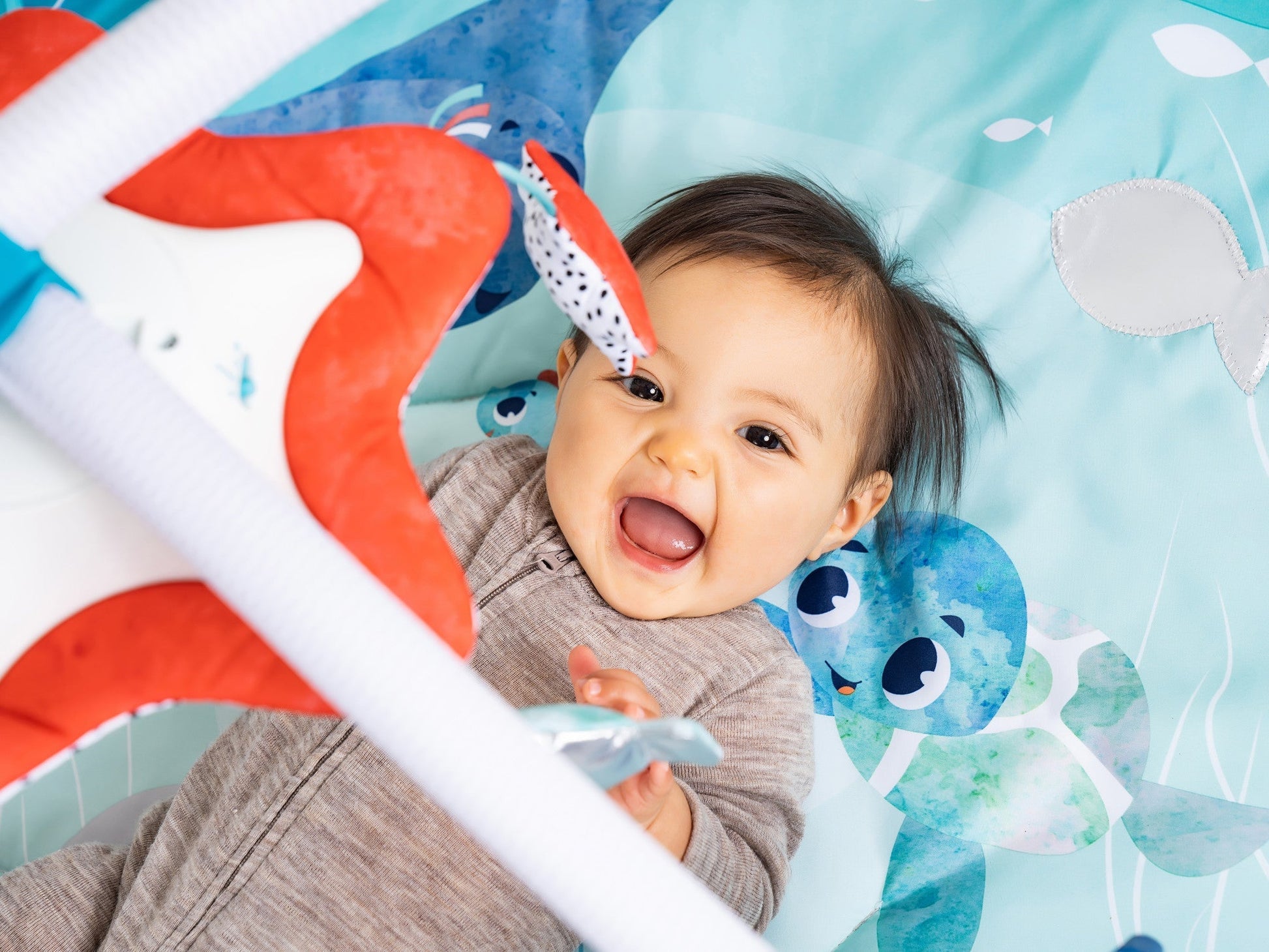 - Exciting activities help extend tummy time and support babys' motor skills.