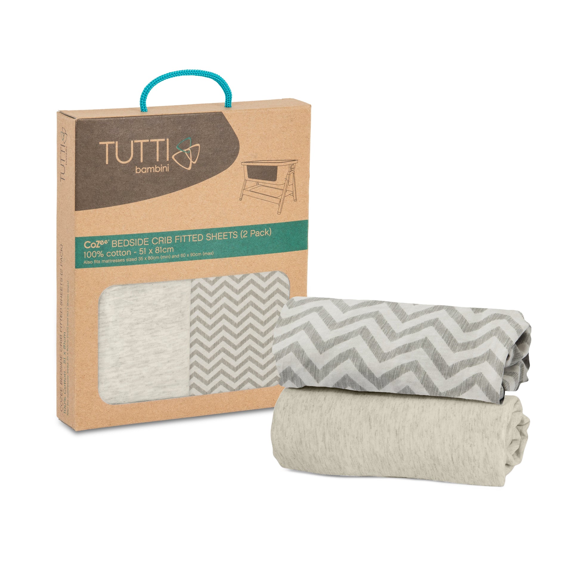 The Tutti Bambini CoZee Fitted Sheets are made from extra soft, breathable cotton and are perfect for dressing your CoZee Bedside Crib. The set includes 2 fitted crib sheets in attractive colors, designed to complement your CoZee crib.